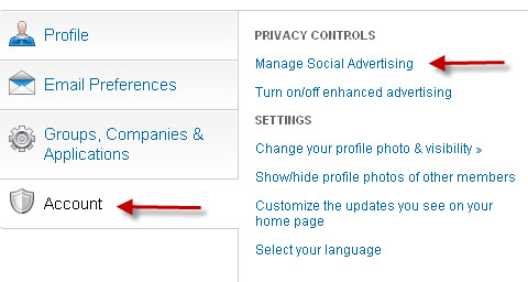 De optie vind je in je settings van je profiel. Klik rechtsbovenin de website op je naam, dan op settings en kies in het tabje account voor Manage Social Advertising.