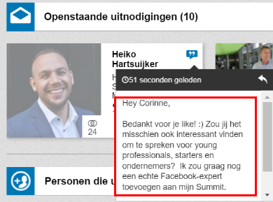 Ik geef het een like omdat ik het een interessante post vind. Verder denk ik er niet bij na, maar vervolgens ontvang ik dit berichtje van Heiko in mijn inbox: