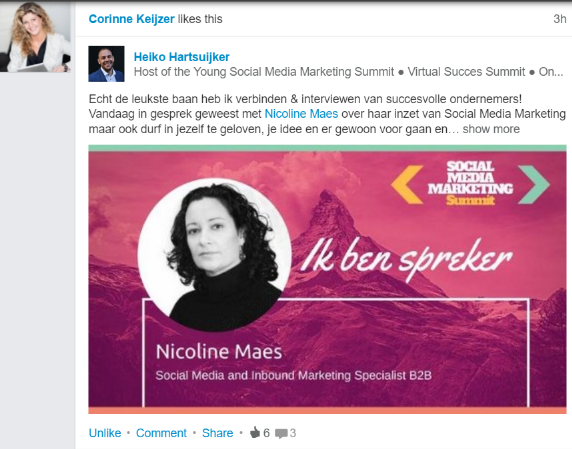 • Vergroot je bereik en zichtbaarheid door zelf af en toe ook eens iets te delen, iets te liken of ergens op te reageren