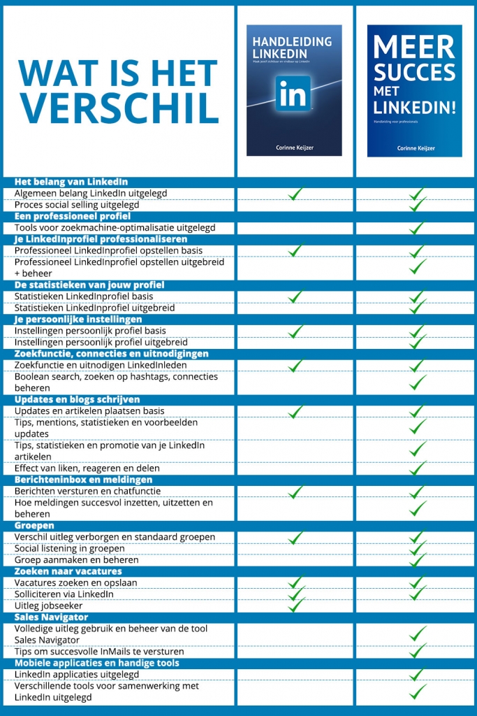 Vaak krijg ik de vraag wat het verschil is tussen mijn gratis ‘Handleiding LinkedIn’ en ‘Meer succes met LinkedIn!‘ welke zowel als boek als e-book verkrijgbaar is. Een meer dan terechte vraag, dus de hoogste tijd om die verschillen eens duidelijk te maken in een handig overzicht.
