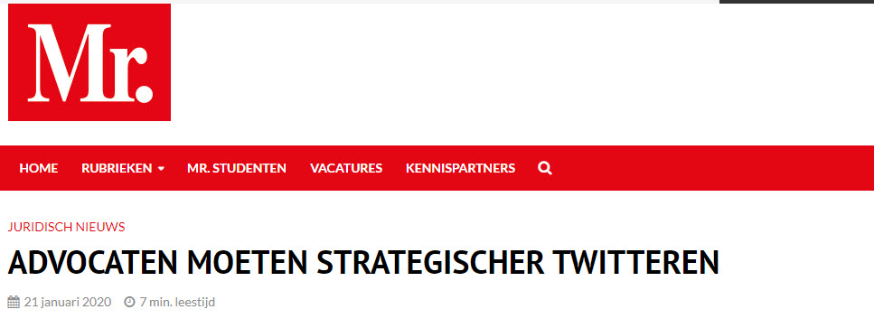 Op 21 januari verscheen op Mr. Online een artikel over twitterende advocaten. Ik vind het een goede ontwikkeling dat ook deze beroepsgroep steeds meer online aanwezig is, het kan zomaar drempels weghalen. Het hele artikel vind je hier: https://www.mr-online.nl/strategisch-twitteren